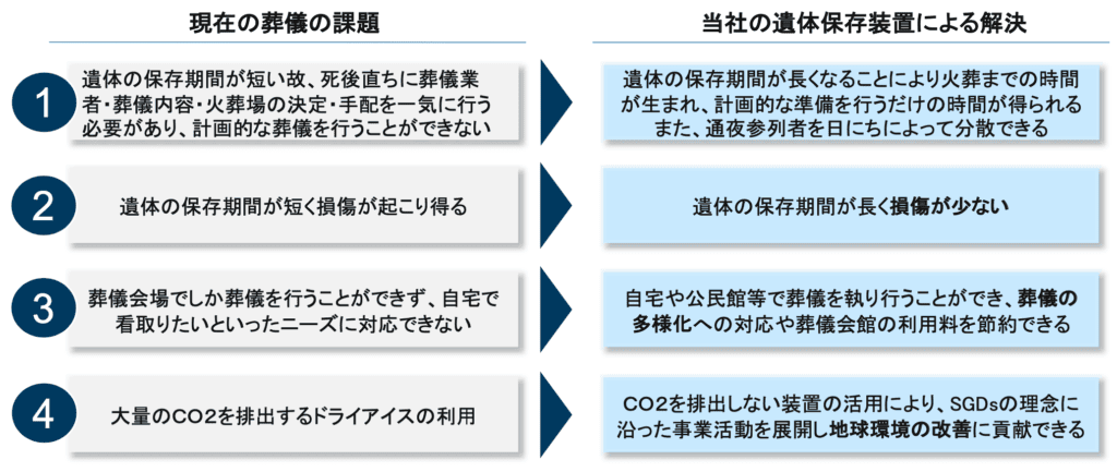 死亡者数は年々増加しており2040年には167万人に増加する一方で火葬炉は大幅に減少し、遺体の保存期間は長期化する見込みです。参入の増加による競争激化や葬儀の小規模化による売り上げの減少に対応するため、葬祭業者は他社との差別化が必要です。また、事業環境としては、SDGsの認知率が大きく向上し、二酸化炭素(CO2)排出量の削減等環境に配慮した製品の需要が高まっています。その状況に対応した、遺体をパーシャル状態で保存し凍結させないことで遺体の美観を長期間維持できる遺体保存装置は、競合製品が存在しない特許取得独自技術による遺体長期保存装置で、火葬待ち日数の長期化が著しい現状および今後見通しにおいて、計画的な葬儀の実施、遺体の損傷の減少、葬儀の多様化への対応、またドライアイスを使用する必要がないことによるCO2の排出削減が可能となり、故人・遺族・環境に配慮した葬儀が実施できます。